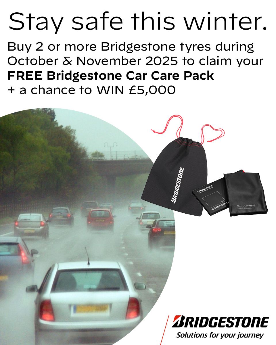 When you buy 2 or more Bridgestone Car, Van or 4×4 tyres in store or online, you’ll receive a FREE Bridgestone Car Care Pack to keep your vehicle winter ready.