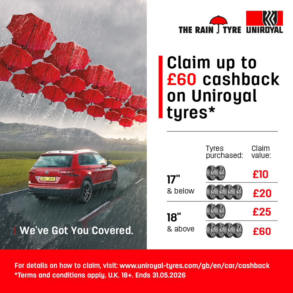 For April and May 2026, Brit Autocentre has teamed up with UniroyalTyres to offer up to £60 CASHBACK claim when you buy two more more car, van or 4×4 Uniroyal Tyres
